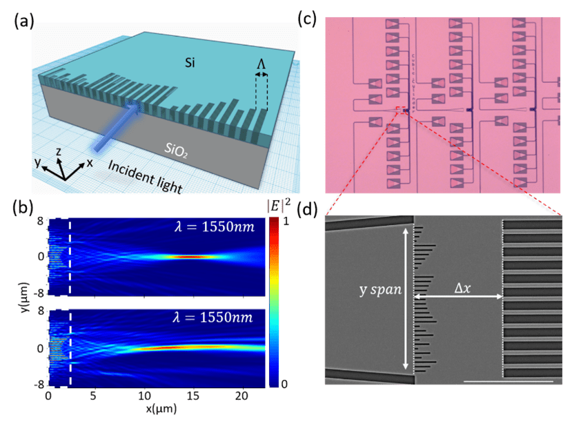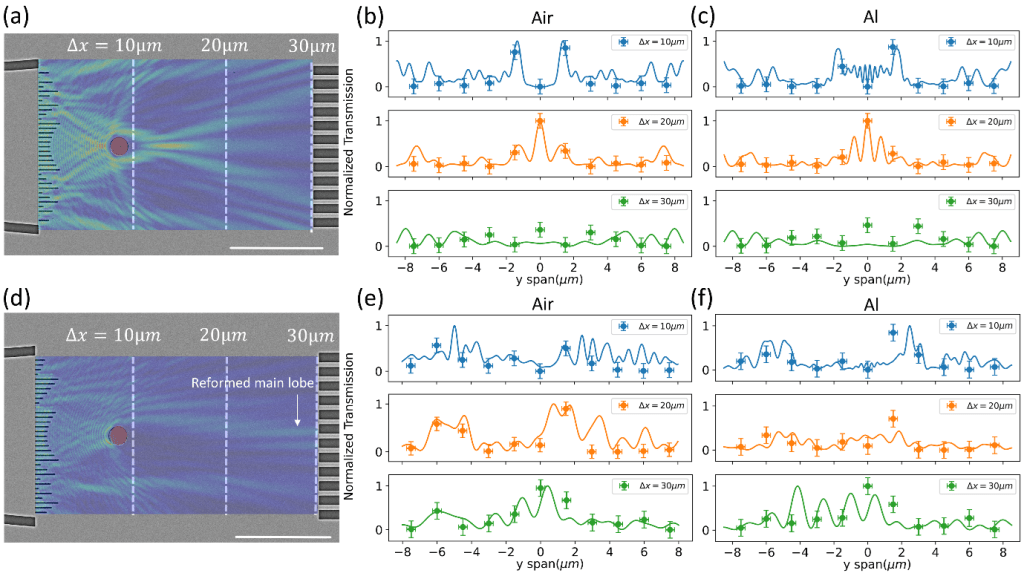 Figure 1. Design of on-chip synthetic-phase meta-optics. (a) Schematic showing the structure of 1D synthetic-phase meta-optics. The blue arrow indicates the direction in which the light is launched into the metalens. (b) Simulated electric field intensity of light focused by a quadratic meta-optics (top) and synthetic-phase meta-optics (bottom). The focal length is 15µm for both metasurfaces and of the synthetic-phase meta-optics is 0.025. The white dashed boxes highlight where the phase masks are. (c)Optica micrograph showing three synthetic-phase meta-optics of increasing . Grating couplers that are used to extract the light intensity at each port are also visible. (d) SEM image of a synthetic-phase meta-optics on SOI (scale bar:10µm).Figure 3. Self-healing of on-chip 1D accelerating beam. (a) SEM showing the quadratic metalens and the circular air pocket (scale bar: 10µm). The scatterer is highlighted with false color and the simulated electric field distribution is overlapped onto the SEM image. The white dashed lines indicate where the optical transmission is measured. (b) Intensity distribution across the y span showing the scattering of Gaussian beam by a circular air hole. (c) Intensity distribution across the y span showing the scattering of Gaussian beam by a circular Al scatterer. (d) SEM showing the synthetic-phase meta-optic and the circular air pocket (scale bar: 10µm). The reformed Airy-like main lobe is indicated by an arrow. (e) Intensity distribution across the y span showing the scattering of Airy-like beam by a circular air pocket. (f) Intensity distribution across the y span showing the scattering of Airy-like beam by a circular Al scatterer. Solid lines are the simulation results and dots are the measured data in experiment at each waveguide. Error bars in x are determined by the lateral span of the intensity point which equals to the 500nm waveguide width. Error bars in y are calculated from the standard deviation of grating coupler efficiency across the whole chip.